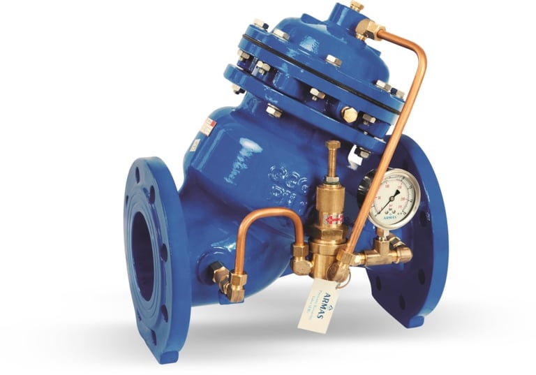 Válvulas Reductora de Presión: También es conocida como reguladora de presión y consiste en un dispositivo de control hidráulico, diseñado para disminuir las altas presiones aguas arriba de la válvula a valores menores y constantes aguas abajo, sin importar las variaciones del flujo, demanda en las líneas y variaciones de presión aguas arriba. Sus componentes básicos son los siguientes: